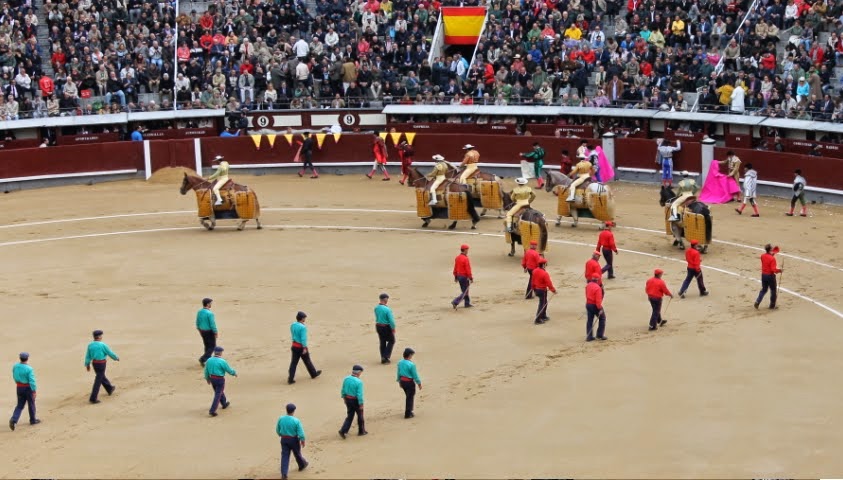 Los toreros de a caballo, escoltados por los rojos y los verdes