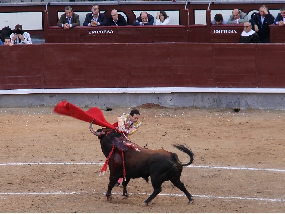 En la terna, dos toreros que necesitan de un aldabonazo para encauzar su próxima temporada, y otro desconocido para todos los que he preguntado. Vayamos con éste. Se trata de Alejandro Amaya, un torero mejicano con 14 años de alternativa. Gracias al préstamo de un programa de mano, me entero de que es su tercera actuación en esta plaza y que es un ligón. Está claro que se le dan mejor las actrices que los toros, porque toreando (si puede llamarse así) no ha ligado ni dos pases y solo ha demostrado su absoluta incapacidad para estar siquiera en la cara del toro, y su indolencia para involucrarse en la lidia de sus toros. Sin apoderado, queda excluido el que haya habido intercambio de cromos. Queda, pues, la incógnita de por qué se le ha contratado. Para colmo, contrató una cuadrilla a su altura.