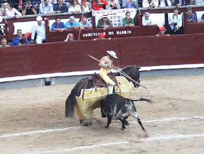 -Para un novillero puede pasar, pero la bernadina no es un pase para ponerse estilo recortador, arqueando la espalda, por mucho que eso caliente al personal. Para terminar con Colombo le diré que supo estar a la altura del cuarto, que tenía su punto de genio, especialmente por el izquierdo, pitón por el que se impuso el toro, con desarme y todo. El primero acabó como el toro de Guisando y se empecinó en ponerse pesado, como es moda, que en malahora aguanta el personal.